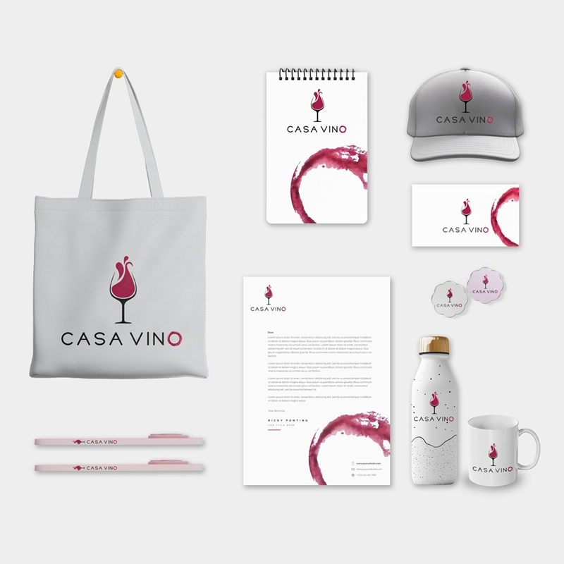 Identidad de Marca - Sistema visual elegante aplicado a papelería y merch, inspirado en el mundo del vino.